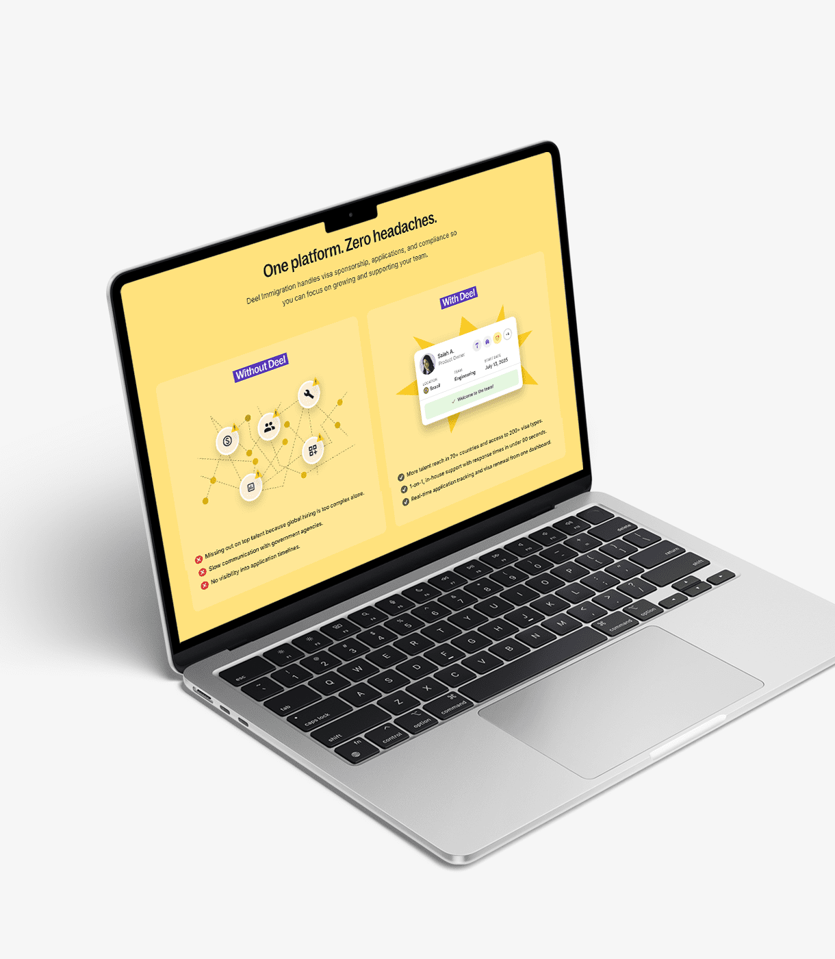 The rebuilt platform significantly improved both speed and scalability. Visa application times were reduced through automation, while user satisfaction increased thanks to a simplified, transparent experience. By integrating human support directly into the digital platform, the client maintained its personalized service model while scaling to meet DEEL’s growing global client base.